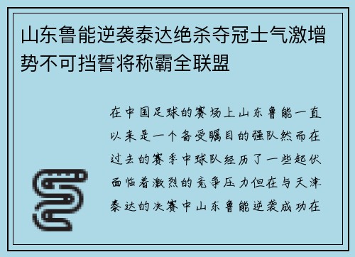 在中国足球的赛场上,山东鲁能一直以来是一个备受瞩目的强队。然而,在过去的赛季中,球队经历了一些起伏,面临着激烈的竞争压力。但在与天津泰达的决赛中,山东鲁能逆袭成功,在最后时刻绝杀对手,成功夺冠。这个胜...