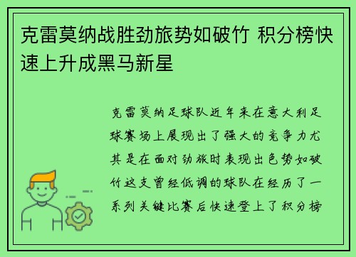 克雷莫纳足球队近年来在意大利足球赛场上展现出了强大的竞争力,尤其是在面对劲旅时,表现出色,势如破竹。这支曾经低调的球队,在经历了一系列关键比赛后,快速登上了积分榜的上游,成为了意甲联赛中的一匹黑马。通...